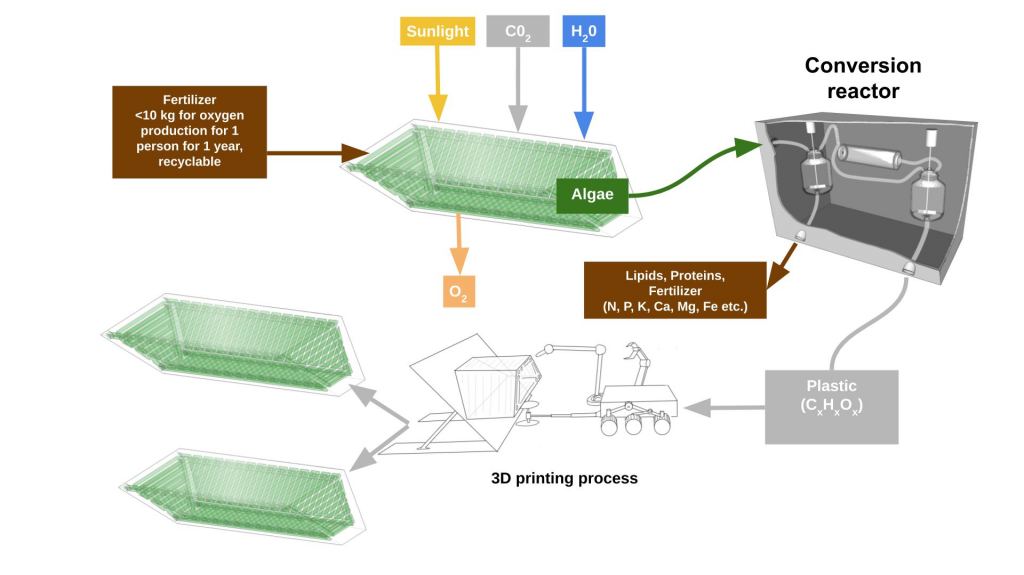 This biomass, which is rich in carbohydrates, is then fed into a conversion reactor to produce polyethylene furandicarboxylate (PEF), a bioplastic derived from carbohydrates (C8H6O). This bioplastic can be used as a bonding agent that is then combined with lunar or Martian regolith to create a polymer composite concrete, which in turn is used as feedstock for robotic 3D printers to create more greenhouses.