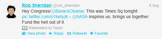 Obama said his administration is putting a big focus on improving science, technology, engineering and math education; however, NASA and other science arms of the government are all facing massive cuts. Perhaps MSL has captured the President's attention enough to, maybe, change his focus. Several people have sent messages to Obama via Twitter, such as this one: