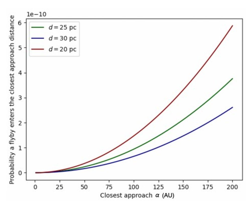 This graph shows the probability that a PBH at initial distances of 20, 25, and 30 parsecs will pass within a given distance of closest approach (α) of a star. For star-Jupiter systems we take α = 15 AU. Image Credit: Brown et al. 2025.