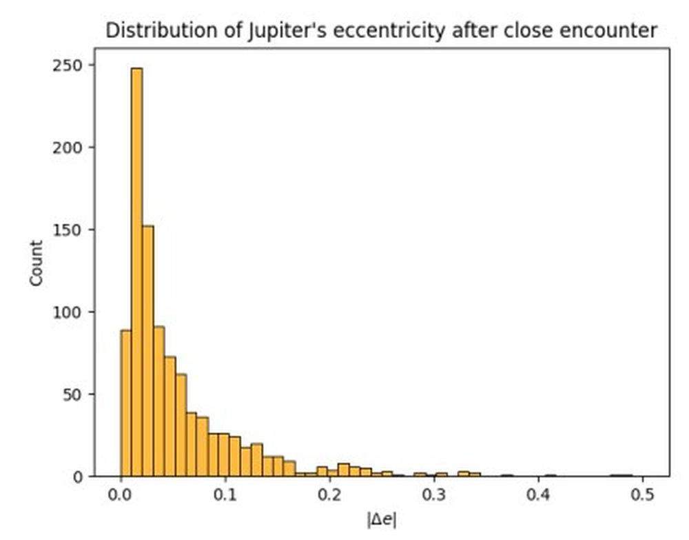 This figure shows the resulting eccentricities in the Jupiter-like planet's orbit after PBH flybys with masses of 0.1 solar masses and a velocity of 200 km/second. Image Credit: Brown et al. 2025.