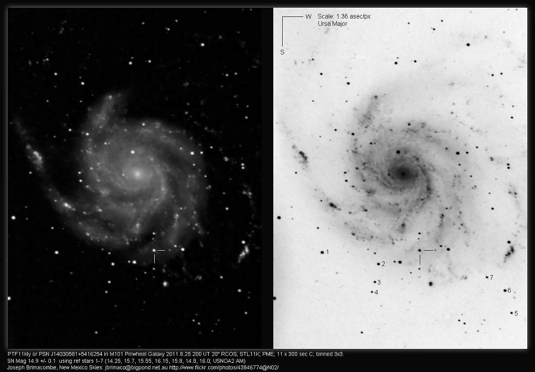 Addendum: "Skywatchers in the northern hemisphere are being treated to a rare, bright supernova in a nearby galaxy, and observers worldwide have the opportunity to contribute scientific data to our study of this object. This supernova, named SN 2011fe, exploded in the nearby spiral galaxy Messier 101 some time on August 24, 2011, and quickly became bright enough for backyard astronomers to observe with modest-sized telescopes. The supernova belongs to the class of objects called "Type Ia supernovae" that are caused by the explosion of a white dwarf in a binary star system. When these stars explode, they briefly give off as much energy as all of the other stars in the galaxy combined, making them visible from millions and billions of light-years away. SN 2011fe is special because it exploded in a galaxy that's "only" 20 million light-years from Earth -- very close compared to the size of the Universe. This gives astronomers a great opportunity to understand better what Type Ia supernovae are like and how they change over time. This is where backyard astronomers can help.