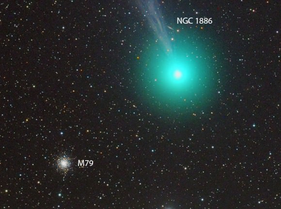 Another striking image of the comet's juxtaposition with the globular cluster M79. Lovejoy is presently 48 million miles from Earth; the cluster lies at the immense distance of 41,000 light years. Credit: Chris Schur[/caption]