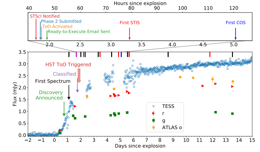 The exploding star was first spotted by the Zwicky Transient Facility, and astronomers also realized that NASA's TESS (Transient Exoplanet Survey Satellite) was observing the supernova, which happened to be in the satellite's active observing area. While both these facilities are good at finding things like supernovae, they're not great at studying them in detail. (TESS's main job is finding exoplanets, but it's spotted many supernovae. In fact, in a paper published a year ago, astronomers predicted that TESS might play a role in detecting a supernova in these early stages of destruction.) Supernovae explosions are a big deal in the astronomy/astrophysics world, so astronomers rushed to point the Hubble and other ground-based facilities at SN 2020fqv.