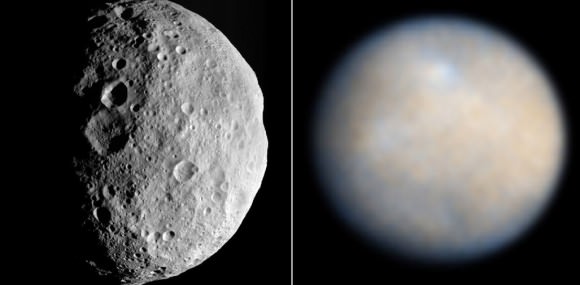 Vesta (left) and Ceres. Vesta was photographed up close by the Dawn spacecraft from July 2011-Sept. 2012, while the best views we have to date of Ceres come from the Hubble Space Telescope. The bright white spot is still a mystery. Credit: NASA[/caption]