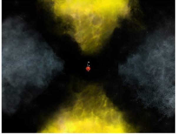 A nova does not explode like an expanding ball, but instead throws out gas in different directions at different times and different speeds. When this gas inevitably crashes together, it produces shocks and high-energy gamma-ray photons. The complex explosion and gas collisions in nova V959 Mon is illustrated here. In the first days of the nova explosion, dense, relatively slow-moving material is expelled along the binary star system's equator (yellow material in left panel). Over the next several weeks, fast winds pick up and are blown off the binary, but they are funneled along the binary star system's poles (blue material in central panel). The equatorial and polar material crashes together at their intersection, producing shocks and gamma-ray emission (red regions in central panel). Finally, at later times, the nova stops blowing a wind, and the material drifts off into space, the fireworks finished (right panel). CREDIT: Bill Saxton, NRAO/AUI/NSF[/caption]