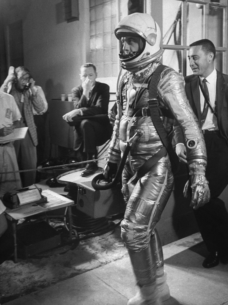 in honor of the 50th anniversary Alan Shepard's flight on May 5. Maybe LIFE saw my Tweets, too, as they contacted us, giving Universe Today permission to publish a few. Above, Shepard strides to the launchpad early on May 5 1961, with Gus Grissom close behind. Shepard reportedly joked to technicians who rode with him to the launch pad: "You should have courage and the right blood pressure" if you want to succeed as an astronaut. "And four legs ... You know, they really wanted to send a dog, but they decided that would be too cruel." In Shepard's right hand: a portable air conditioner to cool the inside of his pressure suit before he enters the capsule.