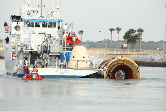 The ships enter Port Canaveral, where the booster is changed from the stern tow position to a position alongside the ship to allow greater control. The ships then pass through a drawbridge, Canaveral Locks, and transit the Banana River to a hanger. They are lifted from the water with specially made Straddle-Lift cranes and placed on rail cars to begin the disassembly and refurbishment process.