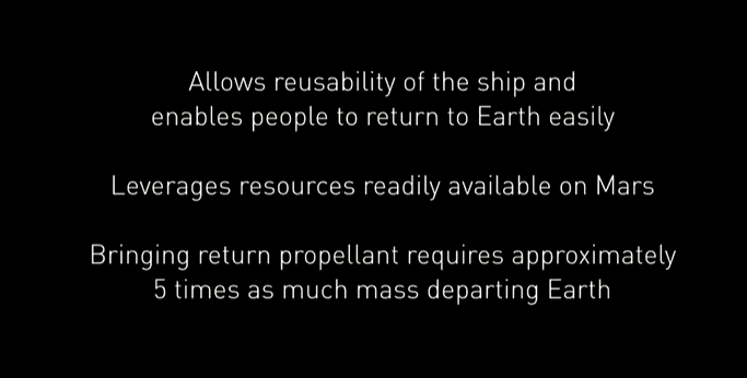 This slide from Musk's presentation show some of the considerations around producing fuel on Mars. Image: SpaceX[/caption]