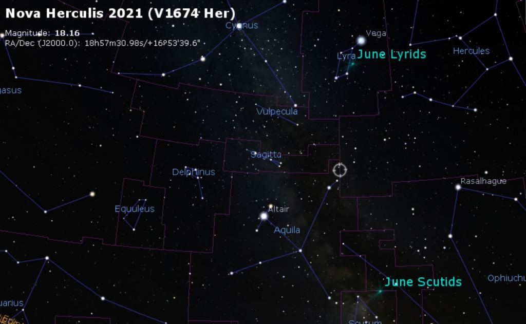 The discovery was made on the night of June 21st, 2021. The 'star' was a galactic nova in the northern constellation of Hercules the Hero, right along its border with Sagitta and Aquila, just off the galactic plane. Soon, the nova had a name: V1674 Herculis (V1674 Her or Nova Herculis 2021).