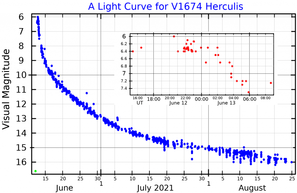But Nova Herculis 2021 had a surprise in store. The nova topped out, flirting with naked eye brightness at magnitude +6 before fading from view in *just one day*. 24 hours after its eruption, the nova had faded a hundredfold. This tops the 3-day record set by Nova V838 Herculis (also in Hercules) in 1991.