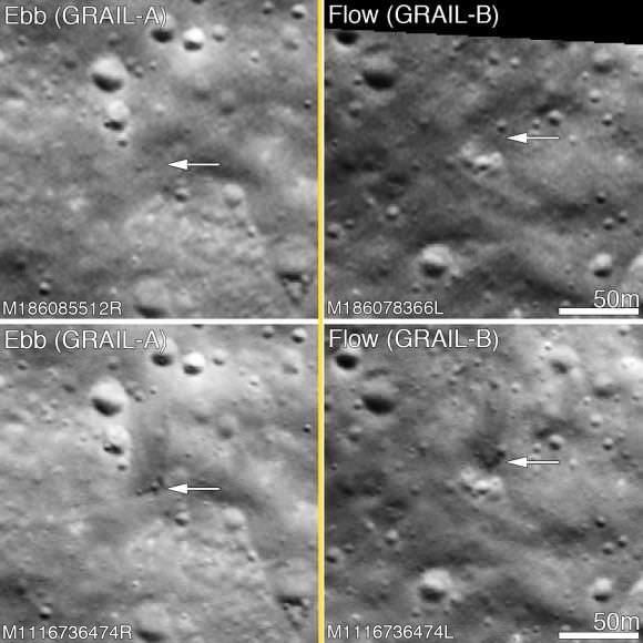 GRAIL A site seen before and after the impact event. Crater center is located at 75.609°N, 333.407°E/ Credit: NASA/GSFC/Arizona State University.[/caption]