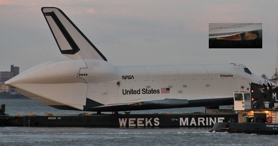 During Sunday's transit of Enterprise across the New York skyline, the shuttle suffered some minor damage to the wing tip (see photo above) soon after she set sail.