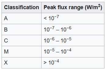 These flares are very powerful compared to the Sun. Scientists classify solar flares on a scale from A to X. Each class is 10 times more powerful than the previous class. They're classified by how strong their X-ray flux is at Earth's orbit.