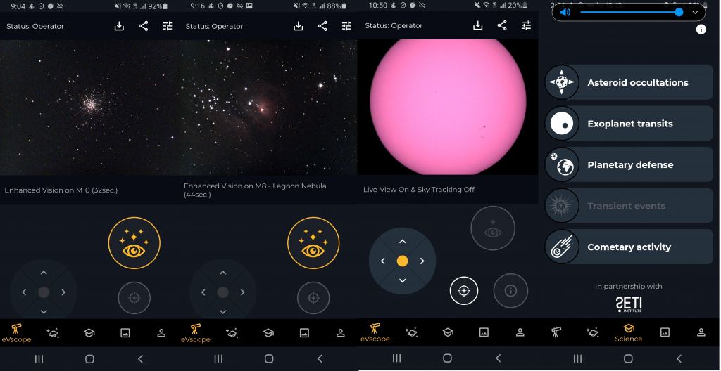 But the really interesting use for the eQuinox is its potential to use the telescope to do real science. To this end, there's a tab in the control app for 'science' were users can scan fields uploaded to SETI/Unistellar's database that are analyzed for 'cometary activity' and 'planetary defense' (think asteroids). Already, users have tracked stellar occultations to map asteroid profiles and followed exoplanet transits, as the light from the host star dips ever so slightly…that's right. Exoplanet transits, followed with a small backyard telescope. (what a time we live in!)