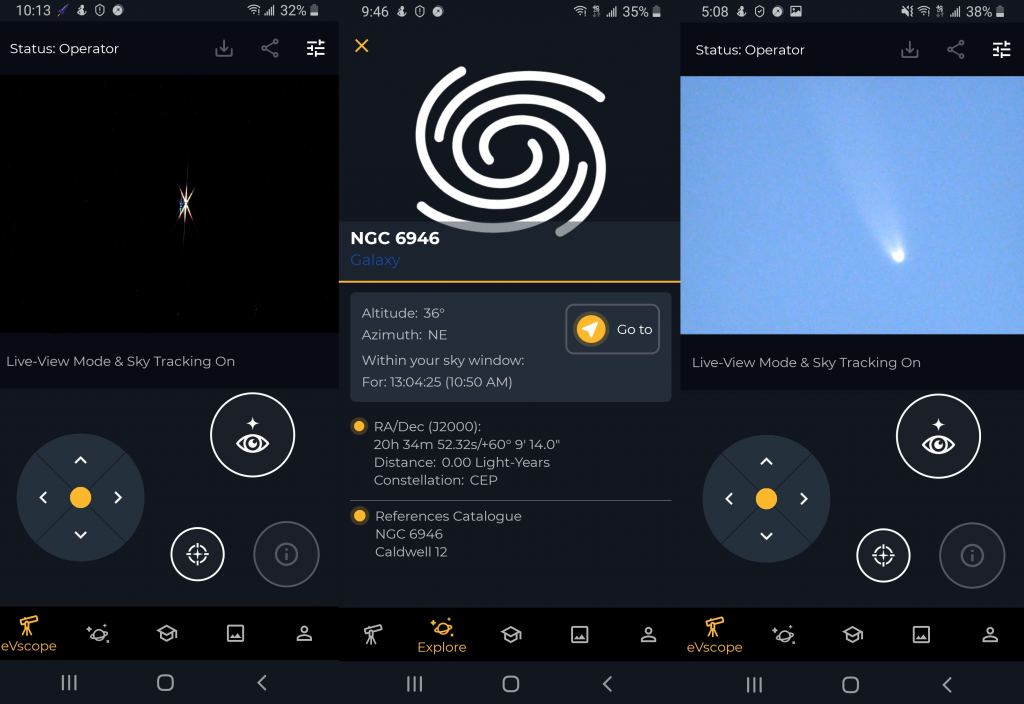 We found the entry mode for right ascension and declination was a bit counterintuitive… still, once we realized the entry was reversed for each section rather than the traditional screen input, it was a snap. It took me a while (and practice) to get the right 'touch' to hand slew slowly vs fast with the virtual joystick. Also, live-streaming was not possible from an Android smartphone, as the wifi connection to the telescope also shuts down mobile data. Unistellar assures us that this is not an issue with an Iphone, as they managed to recently pull the eVscope in to the