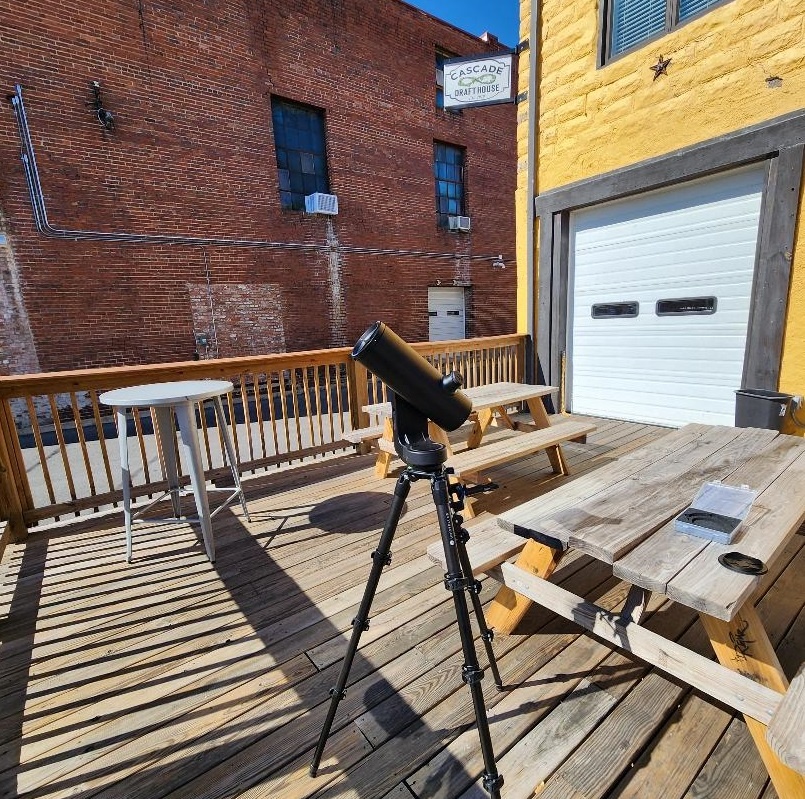 The Odyssey Pro is smaller (85mm aperture, versus 112mm) than the eVscope, but similar in operation. The Odyssey features auto focus technology: no more Bahtinov mask manual focusing like with the eVscope. We also got to try out the smart solar filter for the unit. The filter clicks magnetically in place of the front of the telescope. I'd keep a close eye on the unit when using it this way during public observing, as curious hands could easily snag or pull the filter off during observation. While there's no danger of blinding a viewer, a few seconds of unfiltered Sun could easily damage the telescope. The unit easily found and slewed to the Sun, then focused and color corrected the image.