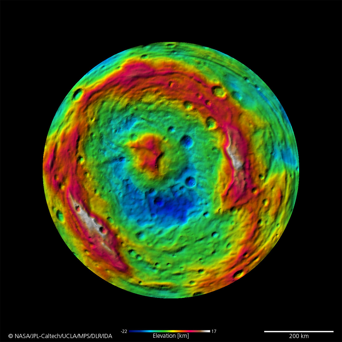 The ancient collision left behind a colossal 300 mile (500 km) diameter and circular gaping hole in the southern hemisphere - nearly as wide as the entire asteroid (530 km) and leaving behind an as yet unexplained and enormous central mountain peak, measuring some 9 miles (15 km) high and over 125 miles (200 km) in diameter. The mountain has one of the highest elevations in the entire solar system.