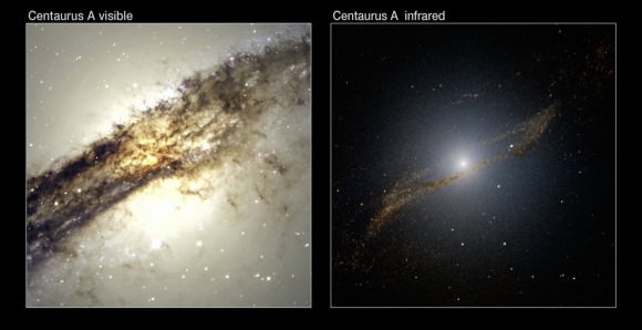 Centaurus A is believe to house a supermassive black hole that has the mass of 200 million Suns at its core, evidenced by the radio emissions streaming out from the galaxy. Previous images of the galaxy from the Spitzer Space Telescope, the ESA's