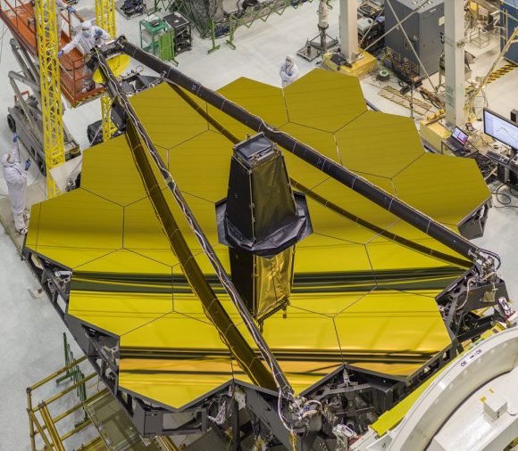 The business end of the James Webb Space Telescope is its 18-segment primary mirror. The gleaming, gold-coated beryllium mirror has a collecting area of 25 square meters. Image: NASA/Chris Gunn[/caption]