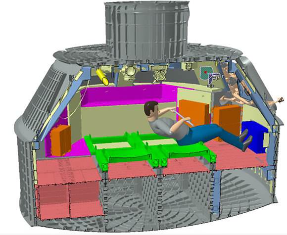 Cutaway of the Orion crew module, showing the ROCKY exercise device in blue, below the side hatch that astronauts will use to get in and out of the spacecraft. Credit: NASA
