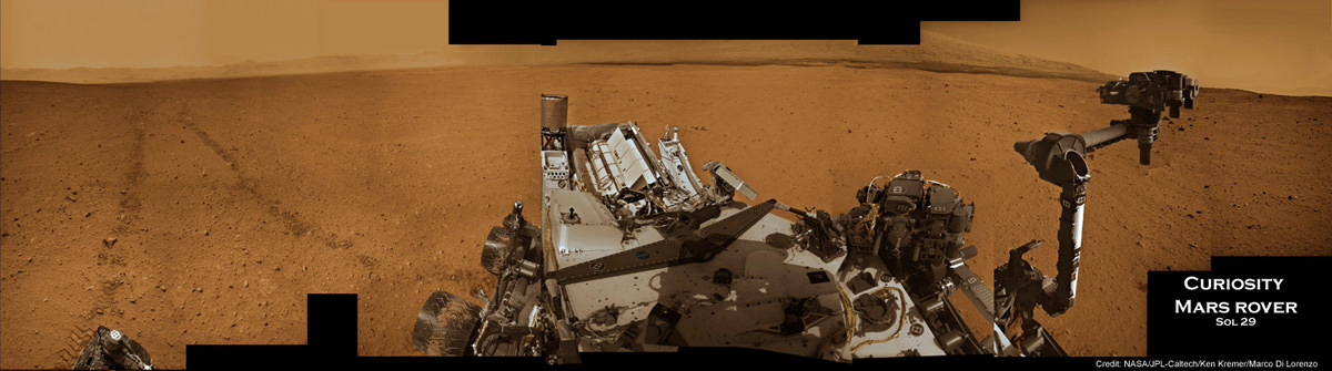 Image Caption: Curiosity at work on Mars inside Gale Crater. Panoramic mosaic showing Curiosity in action with her wheel tracks and the surrounding terrain snapped from the location the rover drove to on Sol 29 (Sept 4). The time lapse imagery highlights post drive wheel tracks at left, movement of the robotic arm from the stowed to deployed position with pointing instrument turret at right with Mt Sharp and a self portrait of Curiosity's instrument packed deck top at center. This colorized mosaic was assembled from navigation camera (Navcam) images taken over multiple Martian days while stationary beginning on Sol 29. Click to Enlarge. Credit: NASA/JPL-Caltech/Ken Kremer/Marco Di Lorenzo