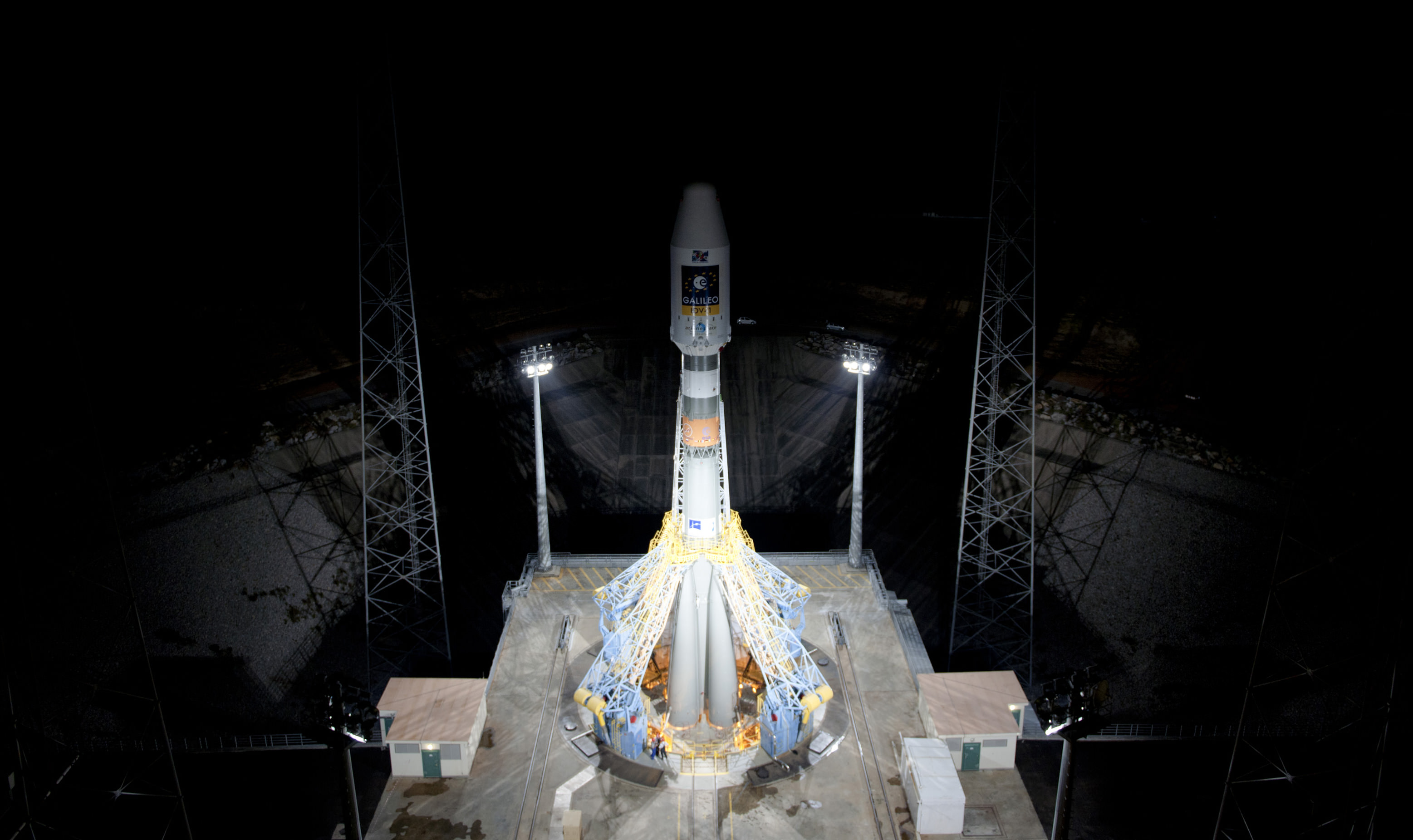 [caption id="attachment_90066" align="alignleft" width="386" caption="Soyuz VS01 on launch pad. Soyuz VS01vehicle was rolled out horizontally on its erector from the preparation building to the launch zone and then raised into the vertical position. The 'Upper Composite', comprising the Fregat upper stage, payload and fairing, was also transferred and added onto the vehicle from above, completing the very first Soyuz on its launch pad at Europe's Spaceport. Soyuz VS01 will lift off on 20 October 2011. The rocket will carry the first two satellites of Europe's Galileo navigation system into orbit. Credit: ESA - S. Corvaja"]