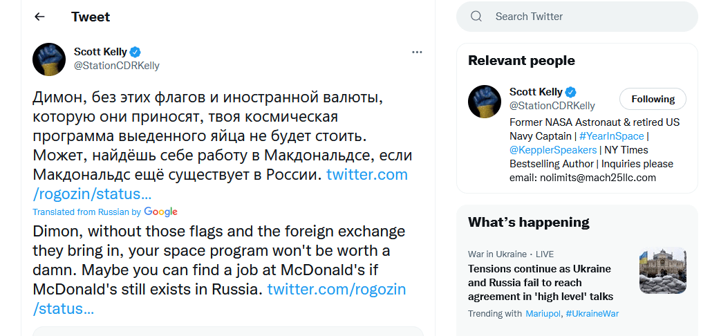 This prompted a response from Scott Kelly, the famous NASA astronaut who spent over a year aboard the ISS as part of the NASA Twins Study. On March 6th, Kelly responded (in Russian), tweeting: "Dimon, without those flags and the foreign exchange they bring in, your space program won't be worth a damn. Maybe you can find a job at McDonald's if McDonald's still exists in Russia."