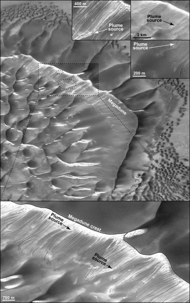 Plumes observable coming off a dune with freshly formed gullies.