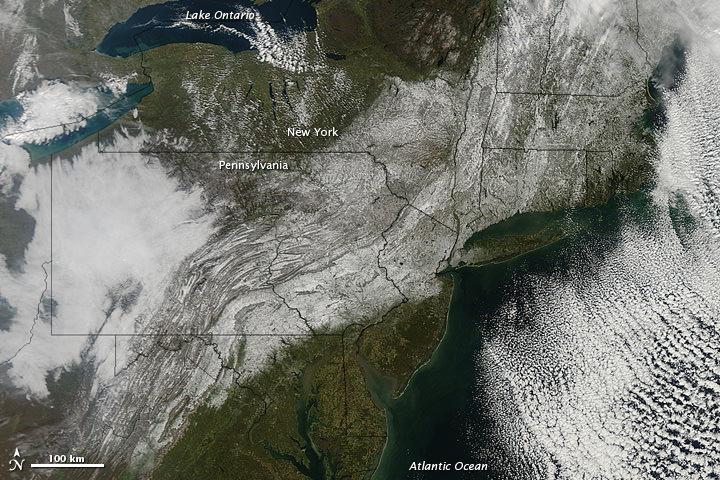 An unusual October storm dumped wet heavy snow across much of the Northeast US over the weekend, as much as 32 inches (81 centimeters) in some areas. Nicknamed "Snowtober," the storm left as many as 3 million people without power at the snowstorm's peak, and was blamed for the deaths of at least 10 people. In this images from the Moderate Resolution Imaging Spectroradiometer (MODIS) on NASA's Terra satellite, a swath of snow sweeps from West Virginia northeastward to Maine, as seen on Oct. 30, 2011. Clouds hover east and west of the snow, blocking the satellite sensor's view of western Pennsylvania and parts of the Atlantic Ocean.