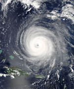 NASA's Aqua satellite took this overhead view of Hurricane Isabel on September 14, 2003 while it was 650 km north of Puerto Rico. The image was acquired using Aqua's Moderate Resolution Imaging Spectroradiometer (MODIS). Isabel is currently a category 4 hurricane, with winds as high as 220 km/h - this is about 15 km/h slower than they were on the weekend. Residents, businesses, and even the military are taking precautions in case Isabel doesn't lose strength and hits the coast of the North America.