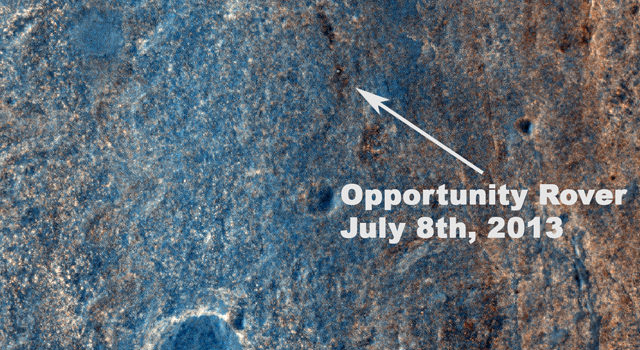 Ten years to the day after the Opportunity rover launched to Mars, the HiRISE camera on the Mars Reconnaissance Orbiter snapped this image of the rover, still toiling away on the surface of Mars. The white dot in the image is Oppy, as the rover was crossing the level ground called "Botany Bay" on its way to a rise called "Solander Point." We're looking into whether there's a way to determine if the rover was actually moving at the time the image was taken.