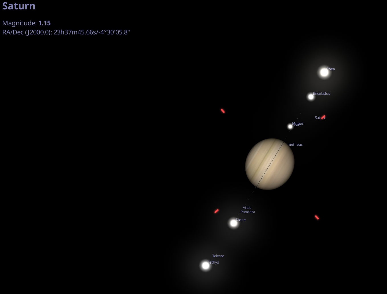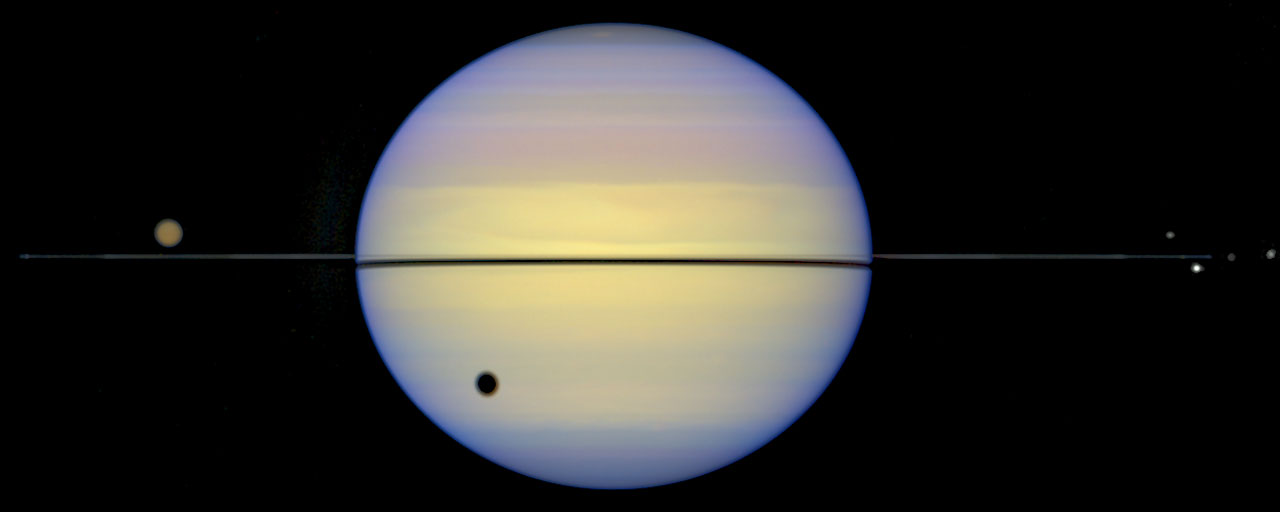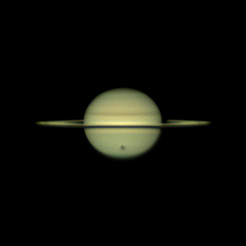 Ring plane crossing years are also a good time to spot moon and shadow transits across the disk of Saturn. Common on Jupiter, these phenomena are only seen on Saturn around the years when the rings are edge on.PDS Rings Node and IMCCE France are great sources for moon shadow predictions. You may also want to simply check Stellarium before a night's observing to see if any events are upcoming. Titan and (very rarely) Iapetus cast good-sized, prominent shadows.