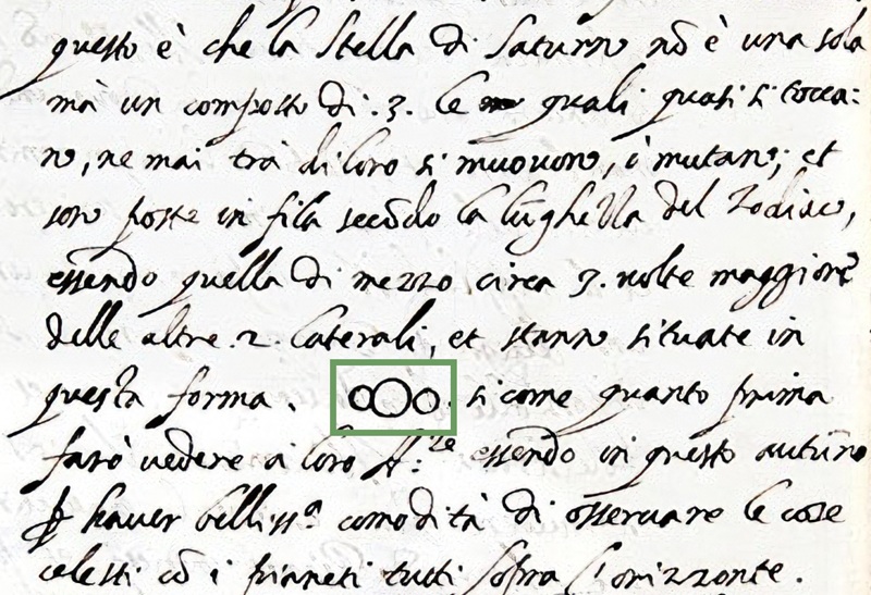 Galileo's notes, including a small sketch of his view of Saturn. From Galileo's Letter to Belisario Vinta, 1610/Public Domain.
