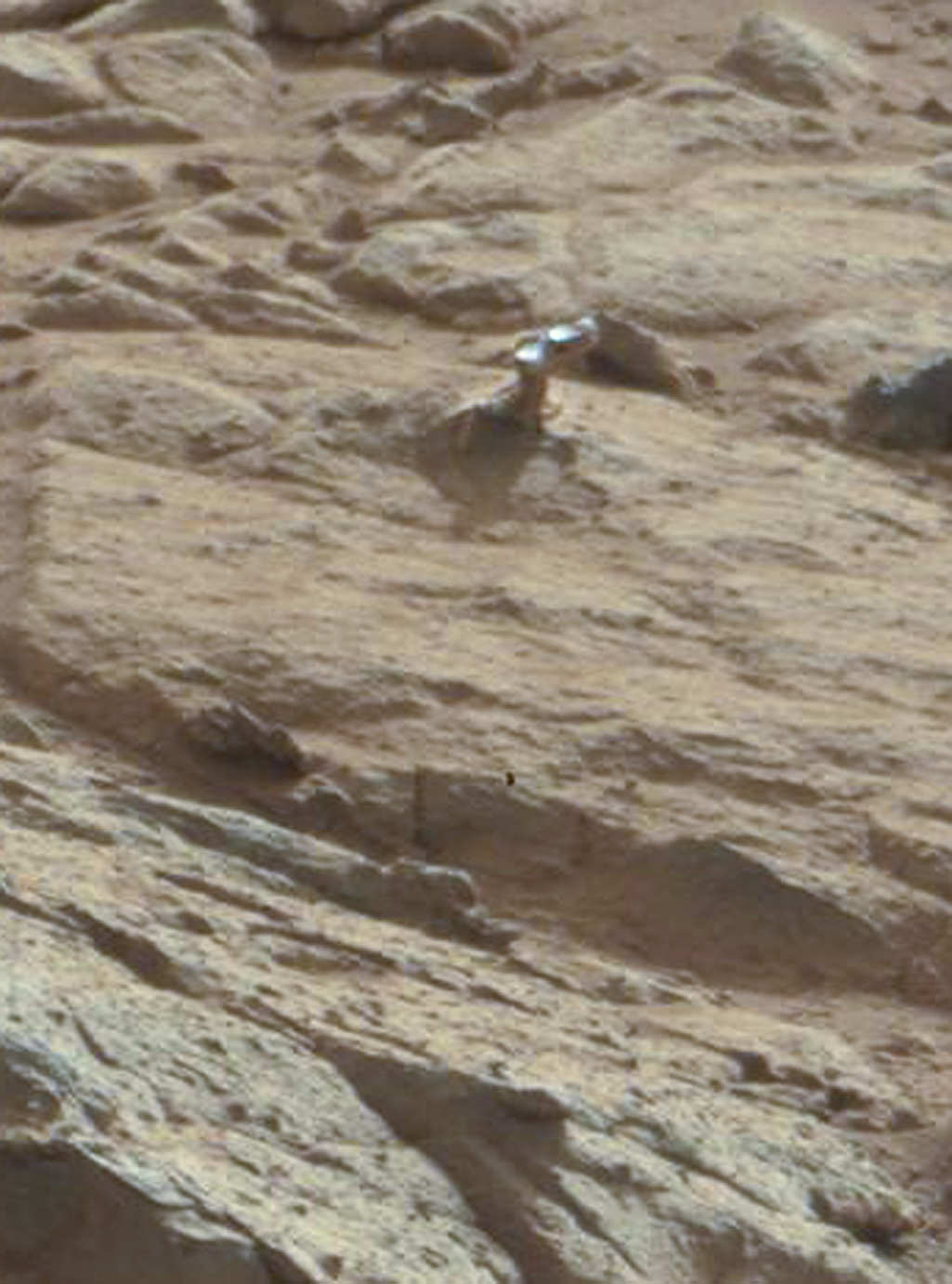 3-D anaglyph from the right and left Mastcam from Curiosity showing the metal-looking protuberance. Credit: NASA/JPL/Caltech/Malin Space Science Systems. Anaglyph by by 2di7 & titanio44 on Flickr.[/caption]