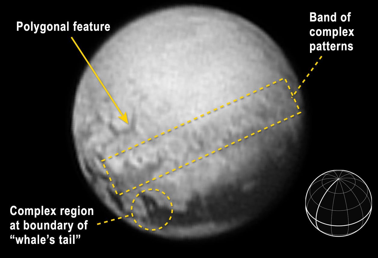 Not only that, but the new photo shows an approximately 1,000-mile-long band of swirly terrain crossing the planet from east to northeast, a large, polygonal (roughly hexagonal) feature and new textures within the 'whale'.