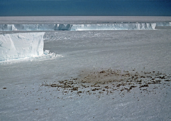 Reddish brown patches of guano on the ice, visible in satellite images, provide a reliable indication of their location.