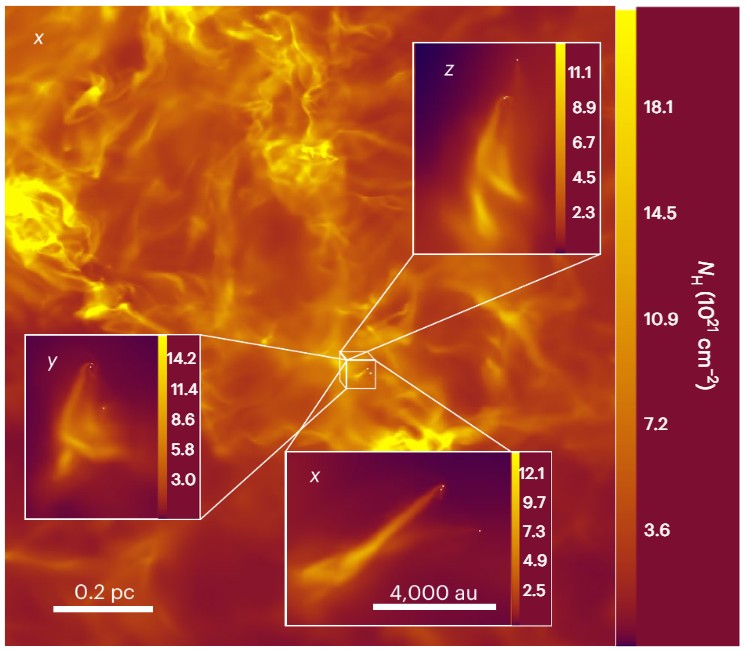 *This figure is a screenshot from the team's simulations. It shows a cube in space holding a triple system of pre-main-sequence stars, with each side of the cube measuring 4 parsecs. The three insets show the tails formed by the Bondi-Hoyle accretion. As the stars orbit, their extended BH tails interweave and twist. The disks around each star are not visible as they are too small to be resolved in this simulation. The colour scale indicates column density. Image Credit: Padoan et al. 2025 Nature Astronomy*