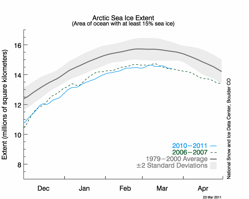 In early April the NSIDC will issue a formal announcement on the 2011 maximum sea ice extent with a full analysis of the winter ice growth season, including graphics comparing 2011 to the long-term record.