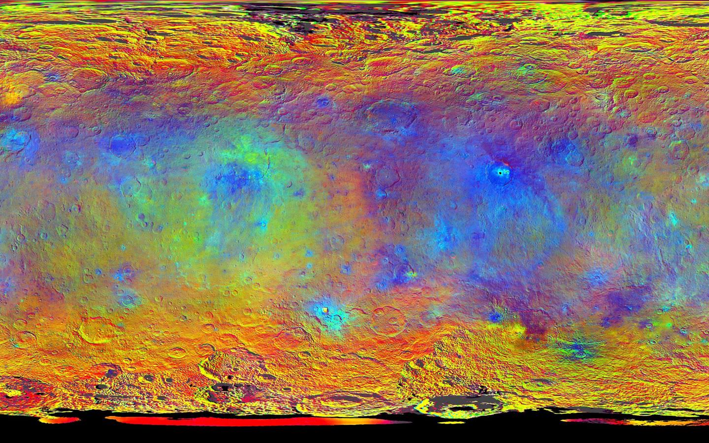 "Scientists use this technique in order to highlight subtle color differences across Ceres, which would appear fairly uniform in natural color. This can provide valuable insights into the mineral composition of the surface, as well as the relative ages of surface features."