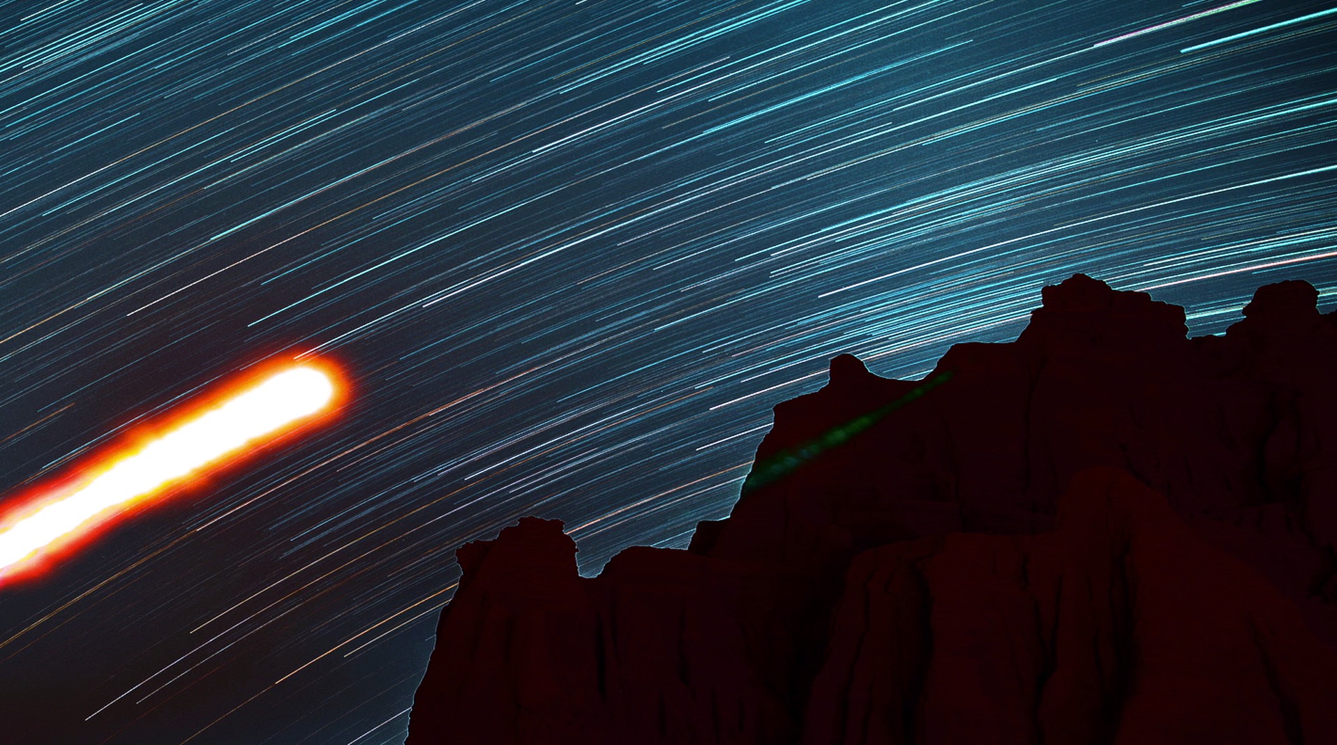 At about 1:50 in the video, you'll see a unique "split" star trail effect, where it looks like the trails are cascading down the sides of a mountain. At 2:02, the Moon appears to burn through the sky like a meteor.