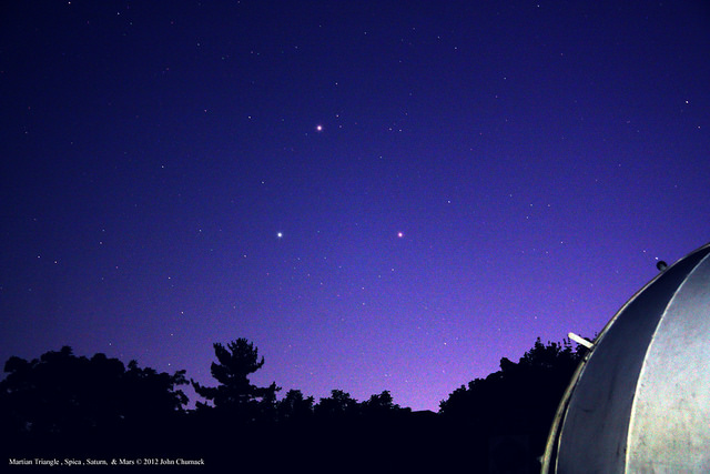 If -- like me -- you've been focusing on all the great images and news coming from the Mars Science Laboratory, perhaps you've missed the great view of the "Martian Triangle," now visible in the night sky at twilight! Astrophotographer John Chumack hasn't missed the view. This image is from August 6, 2012 from his observatory in Yellow Springs, Ohio.