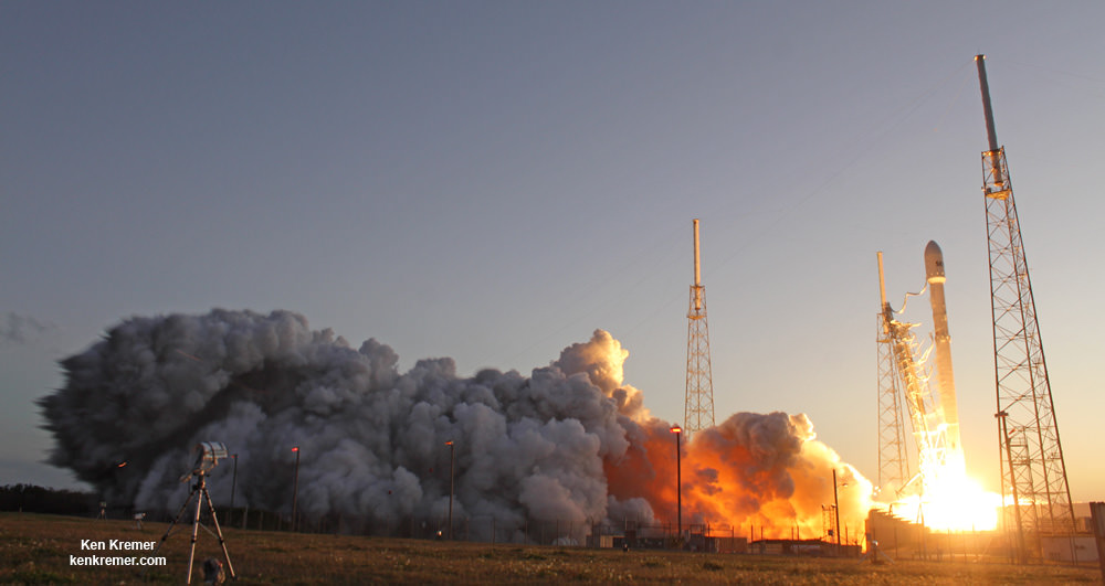Video caption: Spectacular blastoff of SpaceX Falcon 9 rocket carrying SES-9 communications satellite from Space Launch Complex 40 on Cape Canaveral Air Force Station, FL shortly after sunset at 6:35 p.m. EST on March 4, 2016. Up close movie captured by Mobius remote video camera placed at launch pad. Credit: Ken Kremer/kenkremer.com