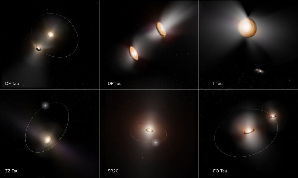 Recently astronomers used radio and optical telescopes to study a collection of so-called "double planetary disks". These are collections of material around binary stars, sometimes also called "protoplanetary disks." They zeroed in on a system called DF Tau because it showed some peculiar characteristics. You'd think the planetary disks in those pairs would be roughly the same since they formed from the same raw materials as their parent stars. However, they show some surprising differences from each other.