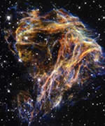 Resembling the puffs of smoke and sparks from a summer fireworks display in this image from NASA's Hubble Space Telescope, these delicate filaments are actually sheets of debris from a stellar explosion in a neighboring galaxy. Hubble's target was a supernova remnant within the Large Magellanic Cloud (LMC), a nearby, small companion galaxy to the Milky Way visible from the southern hemisphere.