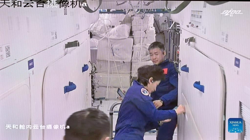 Lead image caption: Screenshot captured at Beijing Aerospace Control Center on June 5, 2022 shows three Chinese astronauts, Chen Dong (C), Liu Yang (R) and Cai Xuzhe, waving after entering the space station core module Tianhe. (Xinhua/Li Xin)