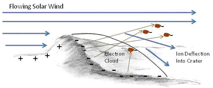 "The electrons build up an electron cloud on this leeward edge of the crater wall and floor, which can create an unusually large negative charge of a few hundred Volts relative to the dense solar wind flowing over the top," said Farrell.