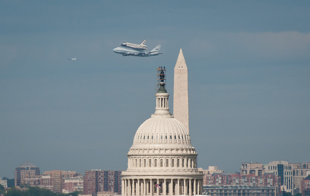 Space Shuttle Discovery, atop its Shuttle Carrier Aircraft, NASA 905, flew over the US national capital region on April 17, 2012 on the final leg of its ferry flight from NASA's Kennedy Space Center in Florida to Dulles International Airport in Virginia, on the way to its final home at the National And & Space Museum's Steven F. Udvar-Hazy Center. The image above shows the duo flying near the U.S. Capitol and the
