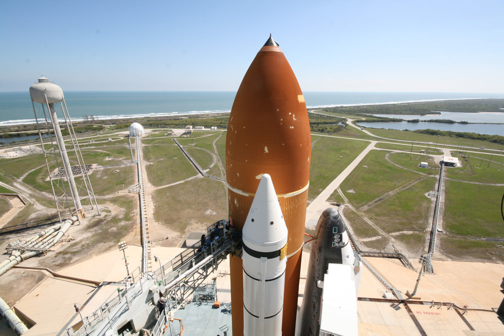 [caption id="attachment_84269" align="aligncenter" width="386" caption="Side view of Space Shuttle Endeavour from on top of Pad 39A at KSC looking out to Florida coastline. at KSC. Credit Ken Kremer"]