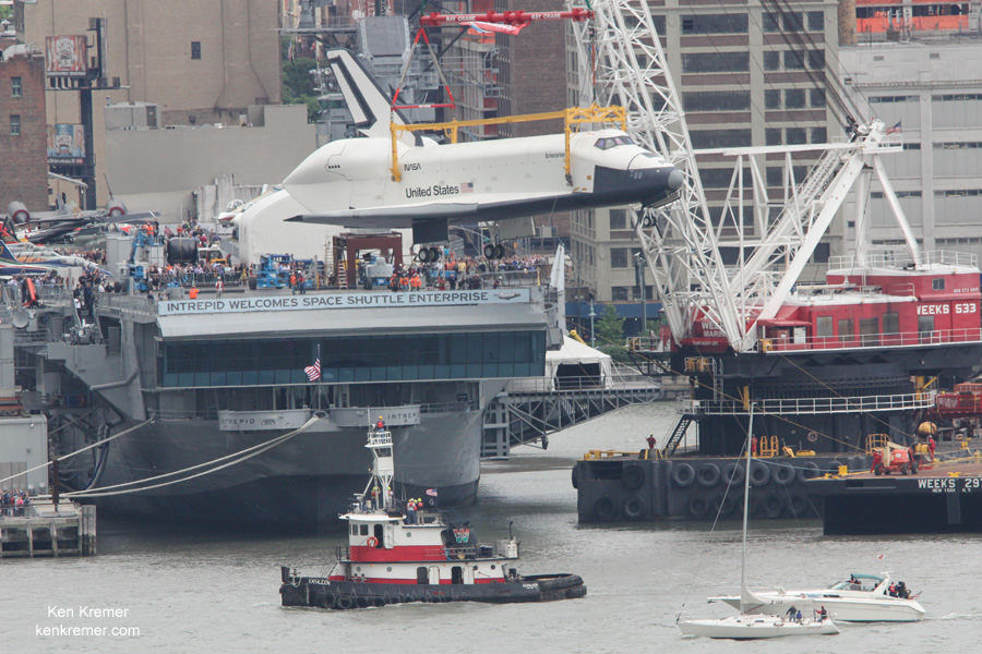 [caption id="attachment_95729" align="alignleft" width="386" caption="A giant Weeks Marine crane hoist Enterprise off the barge and onto the flight deck of the Intrepid Sea, Air and Space Museum on June 6, 2012. Credit: Ken Kremer"]