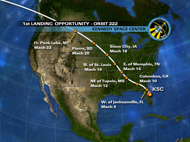 If the weather cooperates, space shuttle Discovery will attempt to land in Florida Monday morning using a so-called "descending node" where the trajectory will take it across the heart of the continental US. "The neat thing about the descending opportunities is it's going to come across the country and folks will get a good opportunity, hopefully, to see the orbiter as it goes overhead," said NASA entry flight director Bryan Lunney. This flight trajectoray hasn't been used since before the Columbia disaster in 2003, to avoid flying over densely populated areas of the US. This descending node trajectory is favorable for adding extra crew time to the mission. The plan is for Discovery's braking rockets to fire for three minutes and 11 seconds starting at 7:43:20 a.m. EDT Monday. This will slow the shuttle by about 217 mph for a landing at the Shuttle Landing Facility at Kennedy Space Center at 8:48:36 a.m. The second opportunity would be at 10:23:30 a.m.